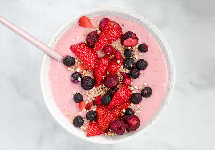 Whether you opt for fresh berries or frozen, you’re likely to enjoy the very same nutritional benefits regardless (score!) so it’s really a question of convenience, affordability, and taste. Do you prefer your smoothies on the icier side? Opt for packaged frozen berries in the frozen food aisle and add them to your smoothies without defrosting. Or if you prefer a juicier berry that’s a little more farm-fresh, peruse your produce aisle instead. Worried your fresh berries will go to waste? Extend the life of your produce and freeze your own berries by popping them into a tupperware and stashing them in the freezer to have on-hand for future smoothies.