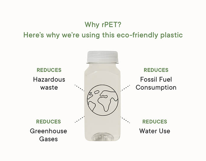 Not all plastic is created equal. While virgin plastic is produced using fossil fuels and its disposal can create toxic chemicals, rPET is different. As the name suggests, rPET is made from recycled plastic. Bottles made from rPET use less energy than bottles made from virgin plastic, reducing fossil fuel consumption, greenhouse gas emissions, water use, and hazardous waste.
