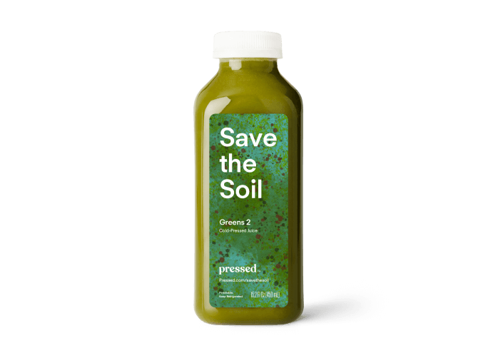 For the entire month of April, Pressed is partnering with Kiss the Ground and spotlighting its Farmland program which supports farmers and ranchers in their transition to regenerative agriculture by providing access to soil health training, funding opportunities, educational resources, and a growing community of regenerative producers and land stewards at various stages of regeneration. As part of our campaign, we’ve designed a special “Save the Soil” label for our Greens 2 juice.