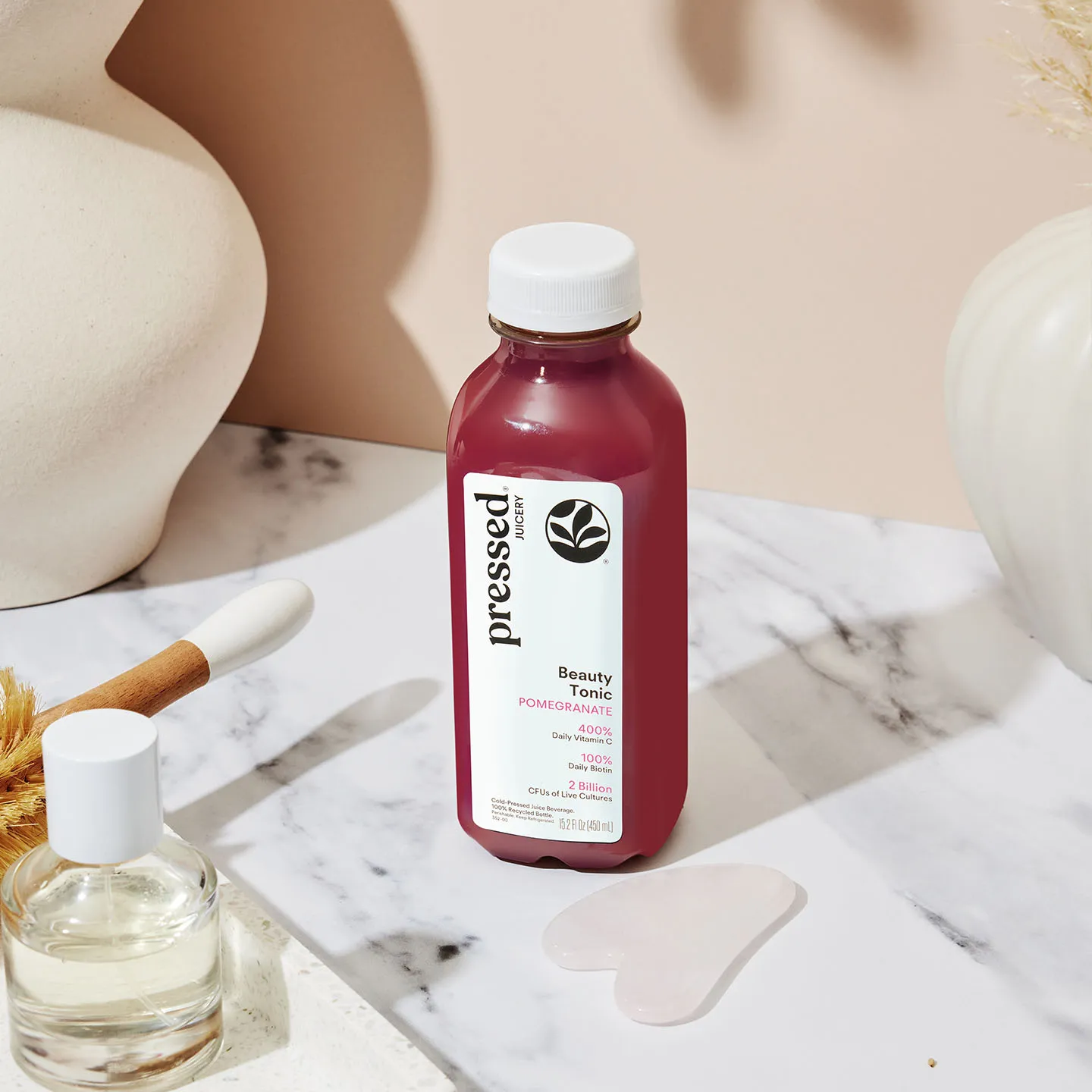 Our Beauty Tonic is a vibrant blend of aloe vera, green tea, pomegranate, ginger, and live probiotics designed to support your daily self-care routine from within. With 400% of your daily vitamin C and 100% DV biotin, this functional tonic helps support hair and skin health, immunity, and overall wellness.