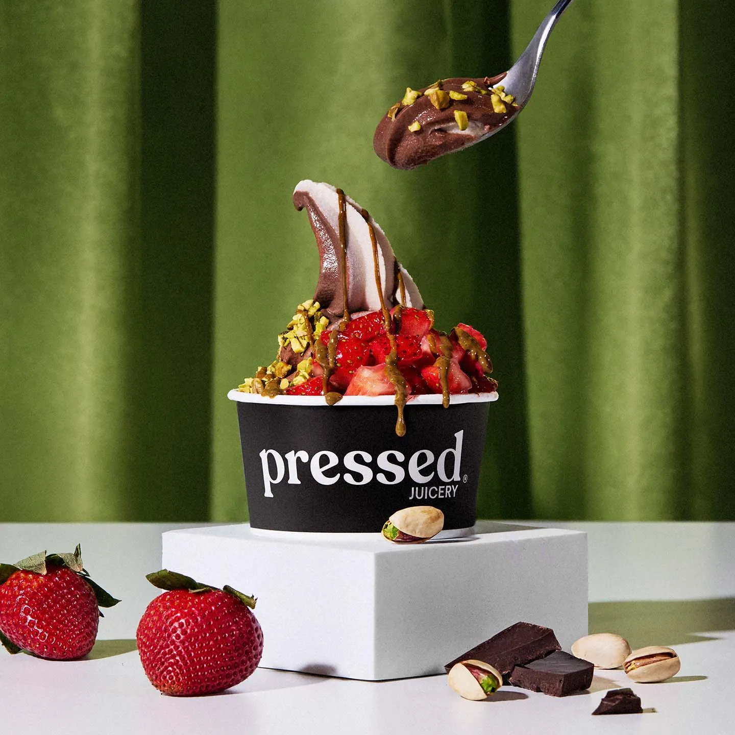 Inspired by the viral Dubai chocolate, our Dubai Chocolate Sundae brings the iconic chocolate + pistachio combo to life, Pressed-style. A dairy-free chocolate + vanilla swirl topped with strawberries, pistachios, and pistachio butter made from 100% pure pistachios. Luxe flavor, elevated with real ingredients.